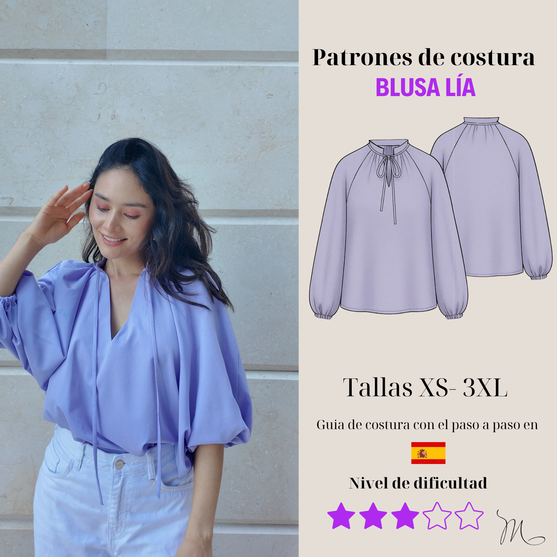 La Blusa Lía es una prenda delicada y femenina con cuello recogido y lazo, mangas globo con puño elástico y silueta suelta. Fácil de confeccionar incluso para principiantes, se adapta a telas ligeras como viscosa, gasa o algodón. Versátil y elegante, es perfecta para looks casuales, románticos o formales.